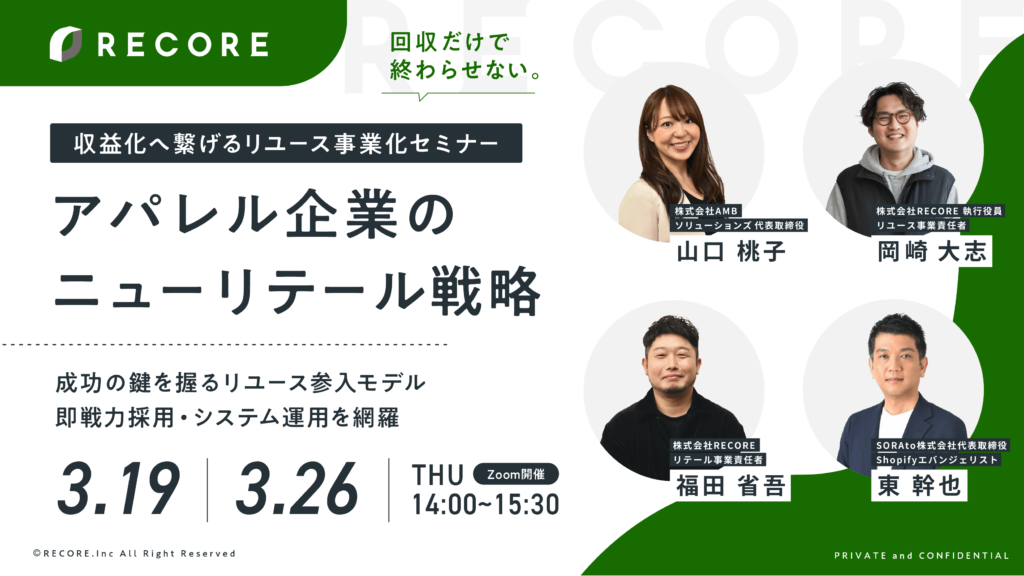 「リユース転職」を運営するAMBソリューションズは、RECORE様が3月19、26日に開催するオンラインセミナーにおいて、『リユース参入を成功させる「即戦力」採用戦略』というテーマで登壇いたします。